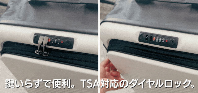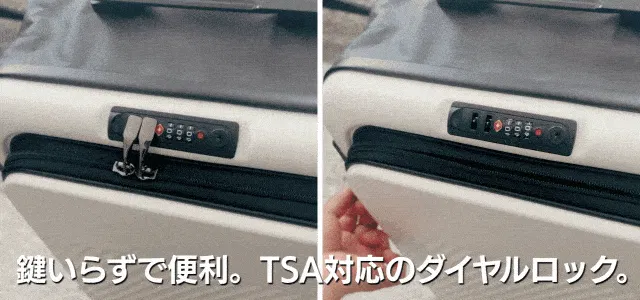 A:はい、ダイヤル式のTSAロック機能付きです。暗証番号式ですので個別に南京錠やカギを持参する必要もありません。海外旅行でも空港のTSA専用マスターキーでのみ解錠することができるのでカギを壊されることもありません。※ダイヤルロック設定方法は購入者様に別途お伝えします。