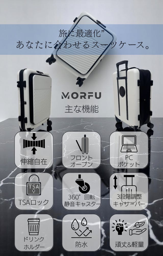 私たちは「豊かで楽しい暮らし」をモットーに生活用品、アウトドア、防災用品専門の企画、販売を行っております。これまで数々の、アウトドア・ガジェット・防災用品など“本当に使えるモノ”を皆様にお届けしてきました。今回ご紹介するスーツケース「MORFU」は、私たち自身が出張や旅行で感じていた「荷物が増えたときの不便さ」「狭い場所での使いづらさ」「収納場所の問題」など、リアルな悩みをもとに企画した、理想の“可変型スーツケース”です。