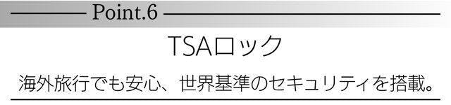 国際基準に対応したTSAロックを標準搭載。アメリカなどの空港でも鍵を壊されることなくTSA職員専用マスターキーで開錠・検査が可能。旅行先でもリスク無く使用でき、セキュリティ面でも妥協のない設計です。