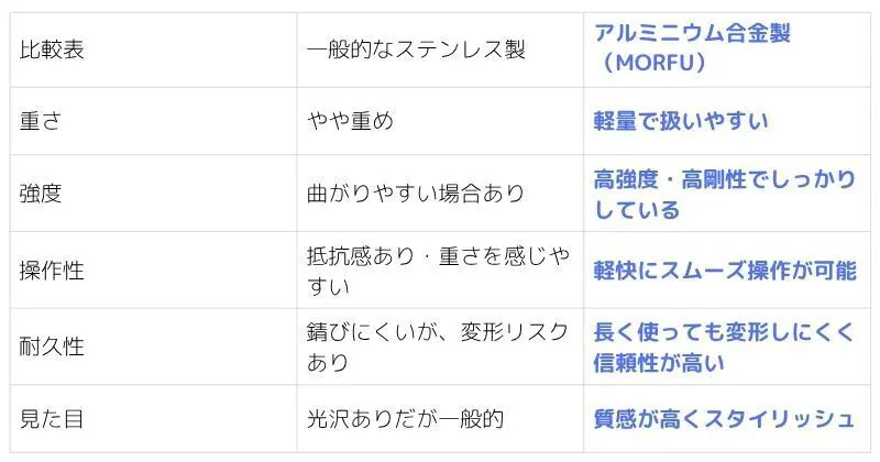 一般的なステンレス製バーと比べて軽量で扱いやすく、曲がりやたわみに強く、長く快適に使えるのが特長です。見た目も高級感があり、移動中の操作感も大きな違いを実感できます。