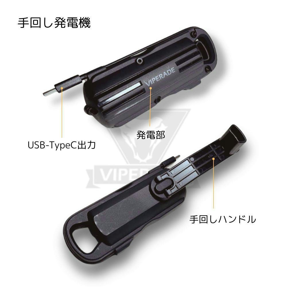 電源がない環境でも手で回せばVAK6はもちろんスマホにも充電可能。