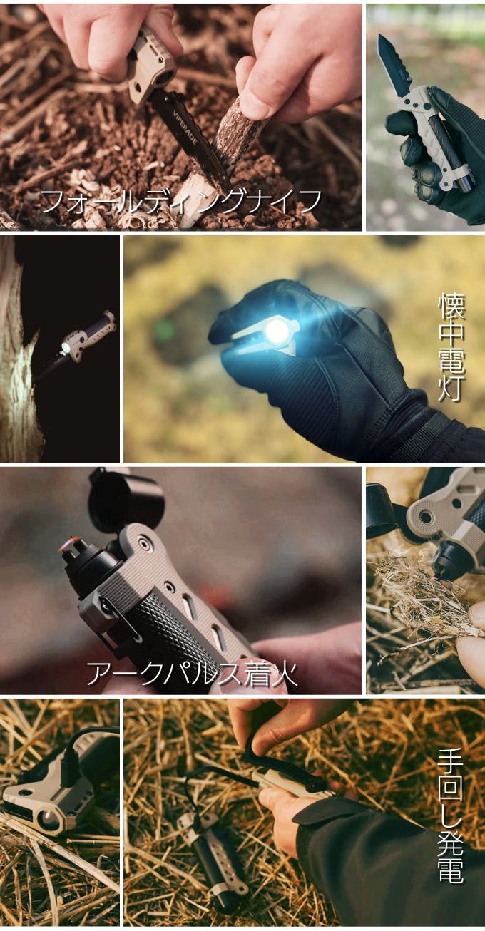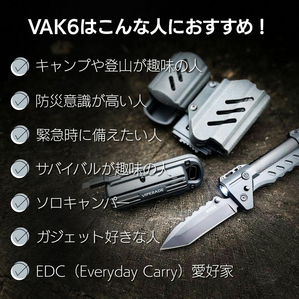 VAK6は、切断、照明、着火、発電という4つの必須機能を統合した本格ツールです。キャンプ、サバイバル、登山、災害時といったアウトドア活動の基本的なニーズを全て満たします。