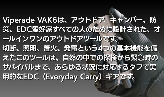 VAK6は、切断、照明、着火、発電という4つの必須機能を統合した本格ツールです。キャンプ、サバイバル、登山、災害時といったアウトドア活動の基本的なニーズを全て満たします。