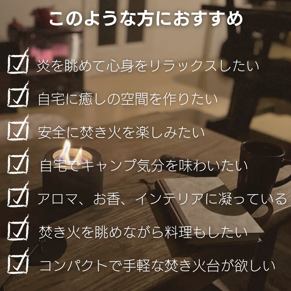 燃料をセットして着火するだけの簡単手順、誰でも手軽に扱えます。時間をかけずに癒しのひとときを楽しめます。
