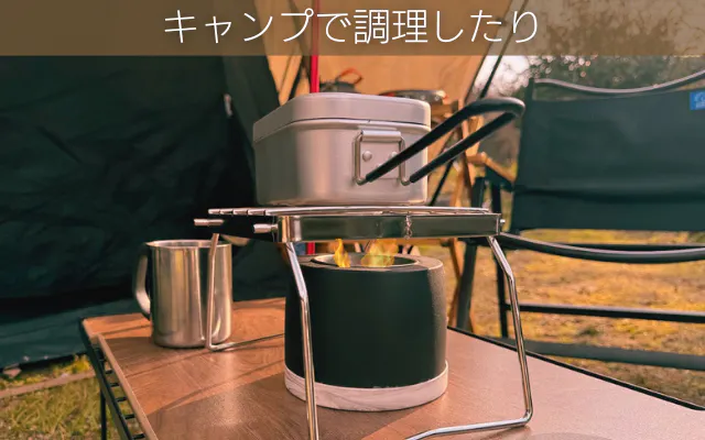 キャンプやバーベキューでの調理にも大活躍。メスティンでご飯を炊いたり、ヤカンでお湯を沸かしたり、直接マシュマロやお肉を焼くなど、アウトドア料理も手軽に楽しめます。