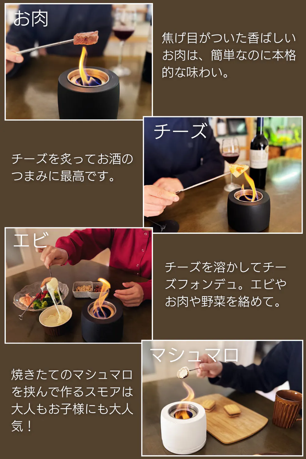 お部屋でもアウトドアでも、手軽に焚き火×料理の贅沢な時間を実現します。