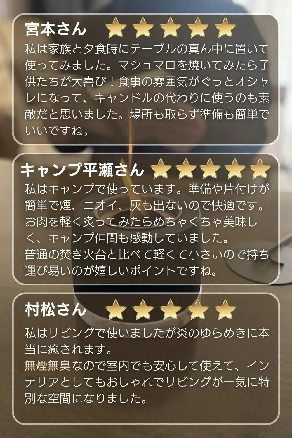シーンに合わせて「炎の癒し」と「空間の演出」を両立し、日常の中に豊かさと特別感をもたらします。
