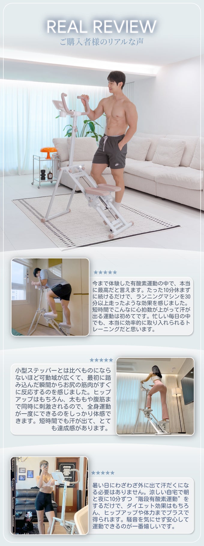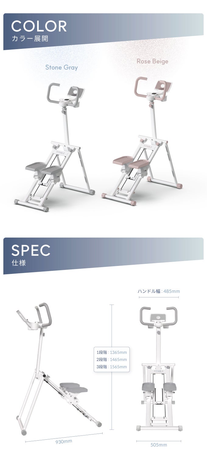 ランニングマシンのような有酸素運動効果と、 ステッパー特有の脚やせ&筋力アップ効果を一度に集約。 踏み込むたびに下半身だけでなく体幹や上半身までバランスよく刺激します。 短時間でも脂肪燃焼と筋力強化を同時にかなえ、効率的に全身を鍛えられます。 “有酸素+筋トレ”を両立する新しいホームトレーニング習慣を体験してください。