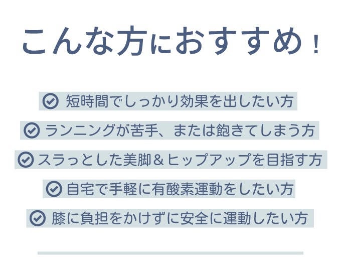 たった1日10分で、約100kcalを消費。 運動強度の高い全身有酸素運動だから、短時間でも効率的に脂肪燃焼。 ジムに通う時間がなくても、自宅で気軽に続けられます。 静音設計なので夜間やマンションでも安心。 “無理なく、でもしっかり効く”ダイエット習慣をサポートします。