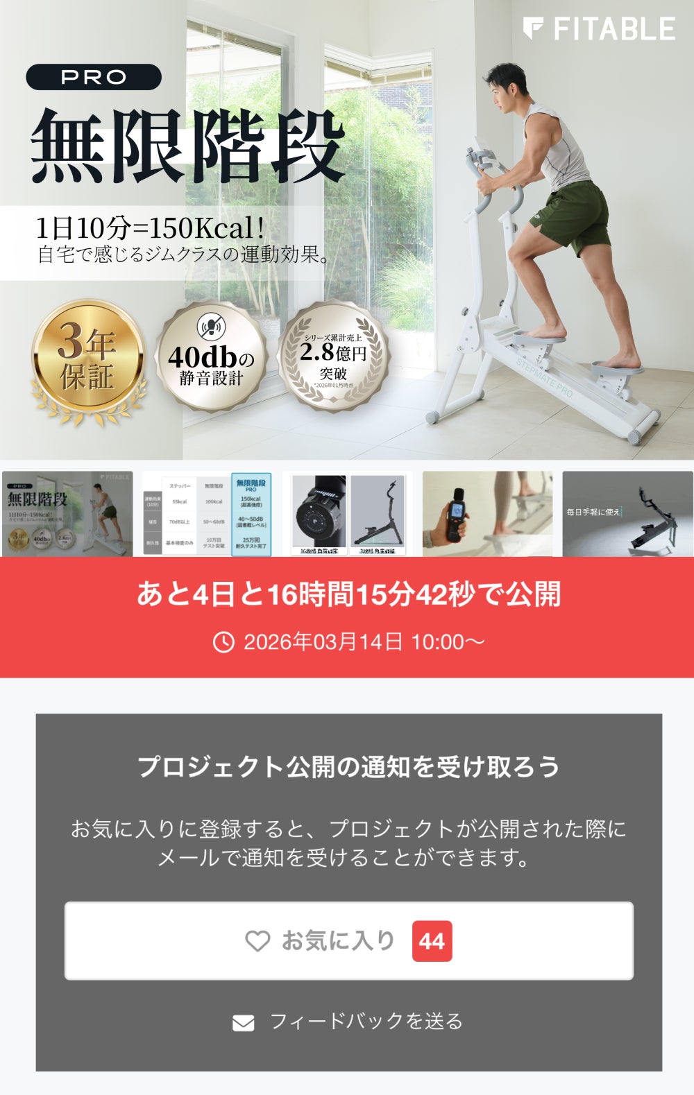 2026/03/07 14:35いつも「無限階段」を応援していただき、誠にありがとうございます。皆様の温かいご支援のおかげで、本シリーズは累計販売額2.8億円を突破する大きなプロジェクトへと成長いたしました。本日は、皆様から多くのご要望をいただいておりました最新モデル『無限階段PRO』の公開日が決定いたしましたので、いち早くお知らせいたします。■ 公開スケジュール2026年3月14日(土) 10:00〜今回の「PRO」モデルは、これまでの実績と皆様からのフィードバックをもとに、さらに進化を遂げた自信作となっております。■ 今回の特別特典【先着限定】最大 42% OFF【3日間限定】LINE友だち限定 10% OFFクーポン(準備中)■ ご注意ください前回のプロジェクト同様、42%OFFの超早割特典は公開から数時間で完売する可能性が非常に高いです。最もお得な条件でのご支援を逃さないよう、今のうちに「お気に入り登録」を完了し、公開直後の通知をお待ちください。■ プロジェクト詳細・お気に入り登録はこちら皆様の期待に応えられるよう、チーム一同最後まで準備に邁進してまいります。新しい「無限階段PRO」に、ぜひご期待ください!FITABLEチーム一同 もっと見るリターンお届けに関する最新情報(発送完了)