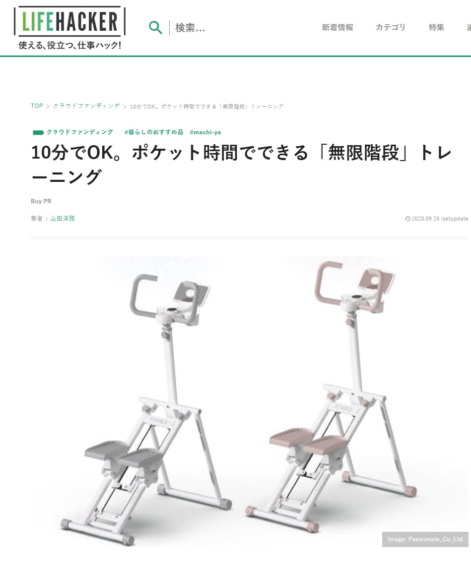 無限階段を実際に使用したレビュー記事がライフハッカーに掲載されました。短時間で効率よく運動できる効果や、使い勝手に関するリアルな体験談が詳しく紹介されています。ここではその内容を少し詳しくまとめます。1日10分でも効果的通常のウォーキングの約2.5倍にあたる運動強度で、わずかな時間でも汗をかきしっかり鍛えられると紹介されています。動画を観ながら続けられる工夫タブレットホルダーが標準装備されており、好きな映画やドラマを観ながら楽しく運動できる点が高評価でした。省スペース設計と静音性畳一枚分ほどのスペースがあれば設置でき、使わない時は折り畳んで収納可能。さらに衝撃吸収構造により夜間や集合住宅でも安心して使用できるとのことです。安全性と安心感KC安全認証を取得し、ステップは3段階で調整可能。耐荷重150kgの頑丈な設計で、家族みんなが安心して使える仕様です。実際に体験したユーザーの視点から「短時間で効率よく運動できる」「毎日続けやすい」と感じた点が多くまとめられています。詳細はぜひ記事をご覧ください。https://www.lifehacker.jp/article/machi-ya-mugenkaidan-review-863220/