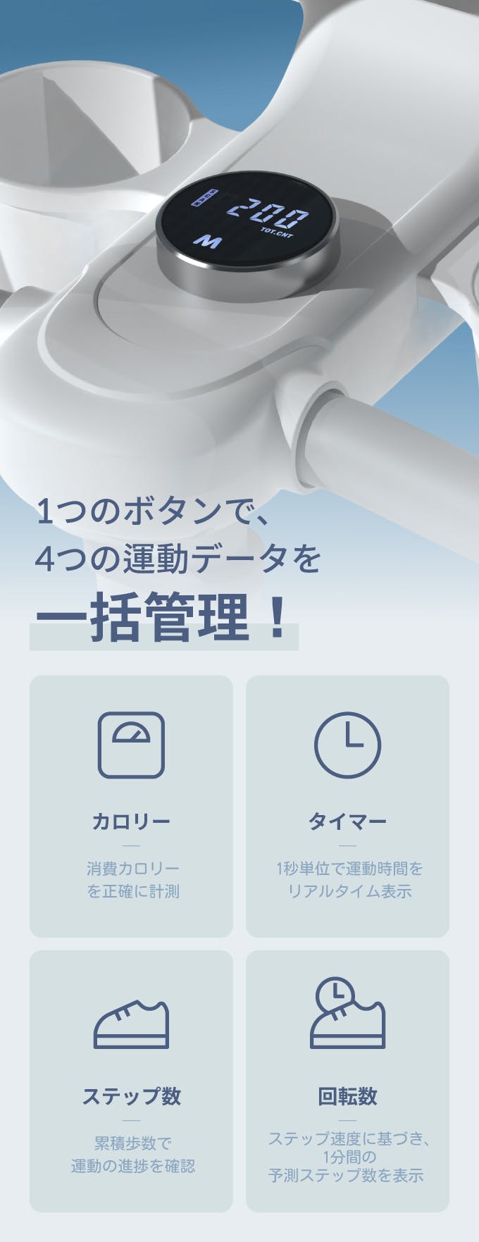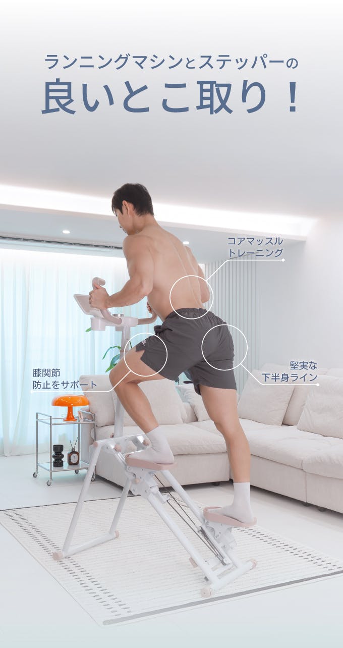 ランニングマシンのような有酸素運動効果と、 ステッパー特有の脚やせ&筋力アップ効果を一度に集約。 踏み込むたびに下半身だけでなく体幹や上半身までバランスよく刺激します。 短時間でも脂肪燃焼と筋力強化を同時にかなえ、効率的に全身を鍛えられます。 “有酸素+筋トレ”を両立する新しいホームトレーニング習慣を体験してください。