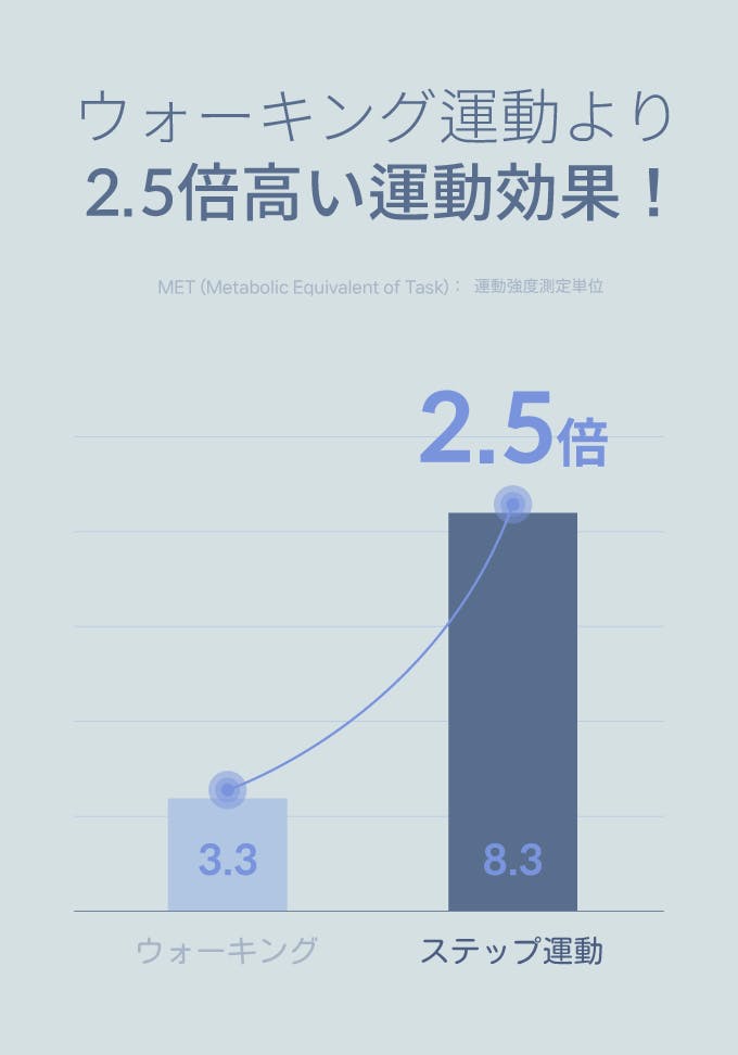 ステップ運動はウォーキングの約2.5倍の運動効果。 国際的に用いられる運動強度の指標であるMET(代謝当量)を基準に測定すると、 ウォーキングが3.3METであるのに対し、ステップ運動は8.3METを記録しました。 これは同じ時間運動しても、消費カロリーや心肺機能への刺激が圧倒的に高いことを意味します。 “短時間で効率よく汗をかきたい”という方にこそ最適な運動法です。