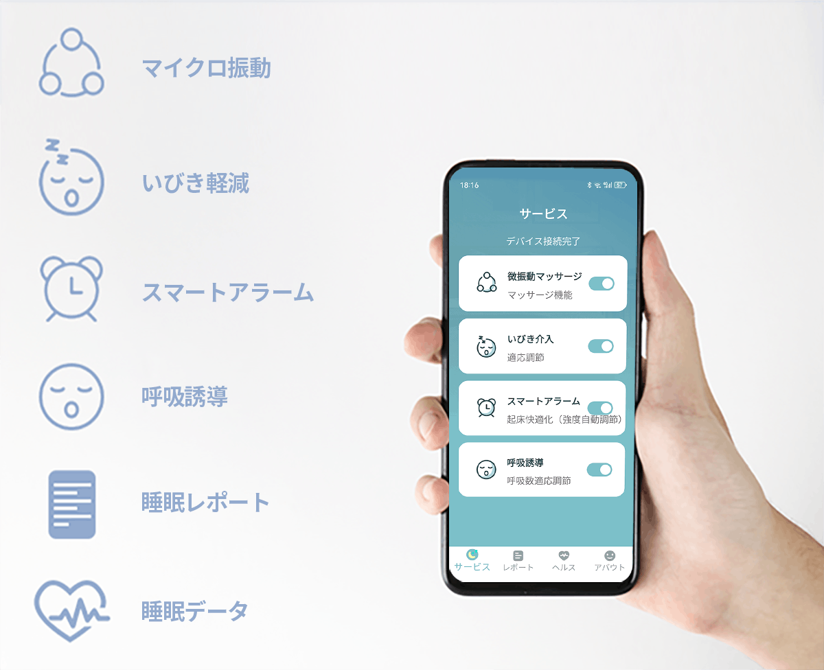 専用アプリで記録されたデータと睡眠レポートが確認できるので、自分の睡眠の質を客観的に把握できます。