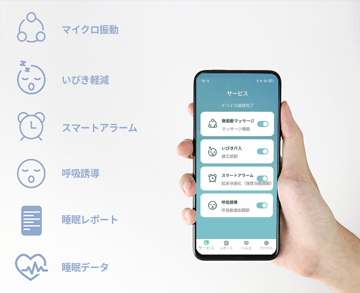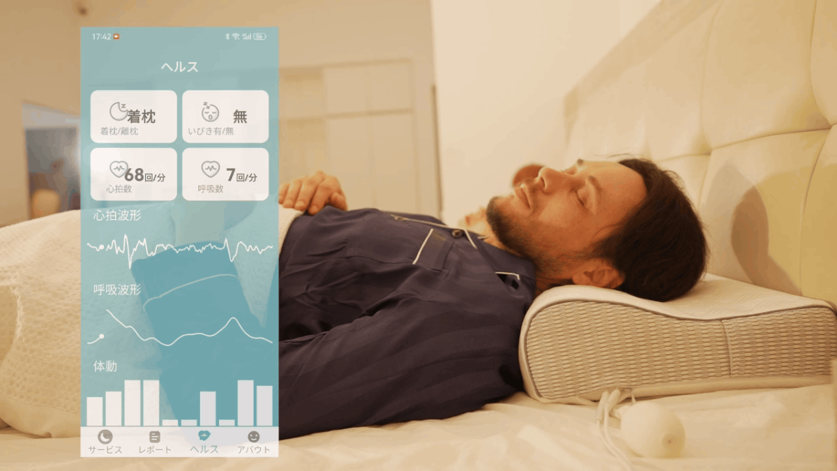 内部には高精度センサーが搭載され、睡眠を邪魔しないまま心拍数や呼吸数、いびきの有無など様々な情報をモニタリングし、枕内部のメモリーに記録。