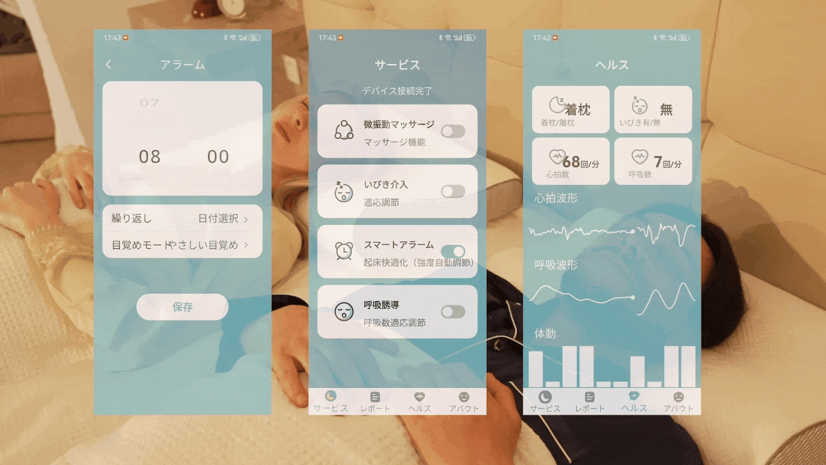 専用アプリで記録されたデータと睡眠レポートが確認できるので、自分の睡眠の質を客観的に把握できます。