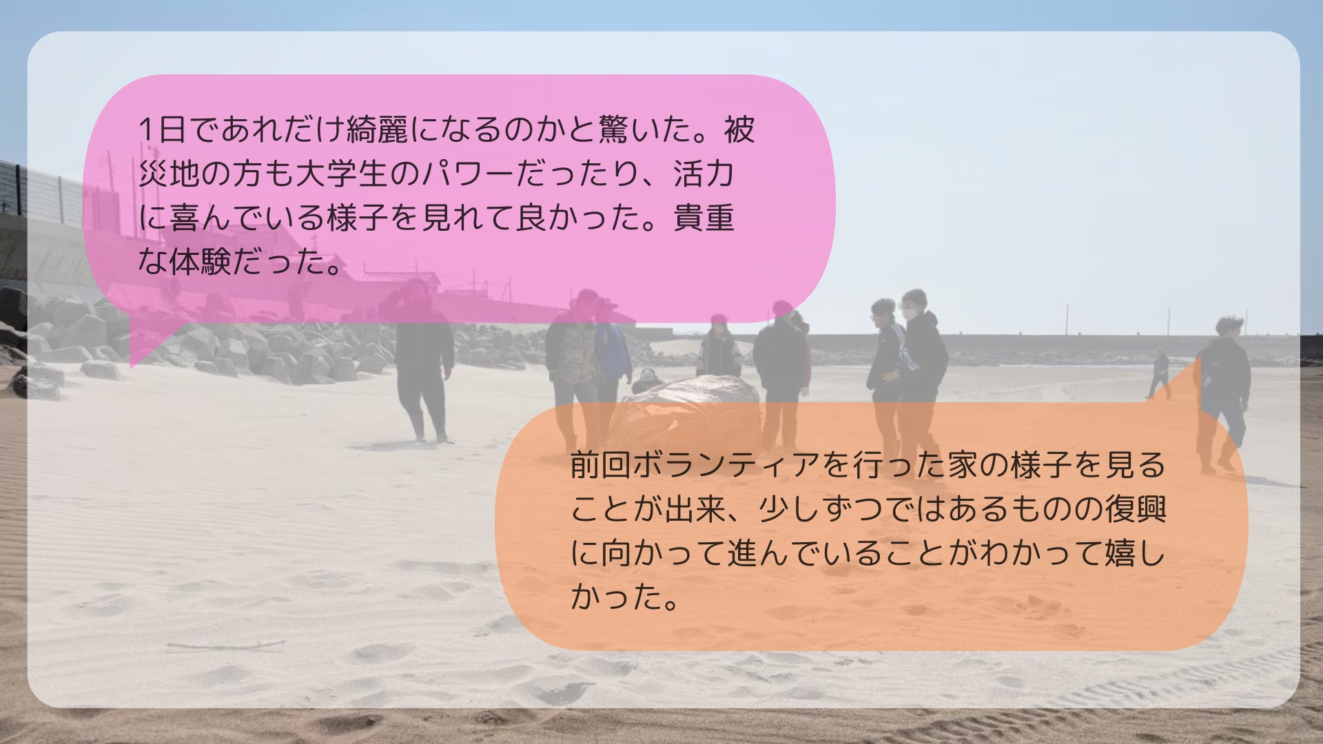 年が明け令和7年3月に第3回ボランティアバスを実施しました。ビーチクリーンのお手伝いだったのですが、一大イベントだったからか、輪島黒島町に明るさを感じました。海岸に打ち上げられた、川から流れてきたゴミや木を片付け、最後にはとても綺麗なビーチを見ることが出来ました。