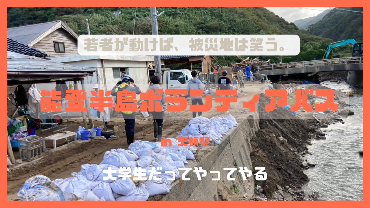 能登半島地震•水害に対する過去ボランティアバスの参加者から頂いた感想を紹介させていただきます。感想Mさん : テレビで視覚としての情報しか知らなかった能登震災の状況を、においや重さなどボランティア活動を通してしか得られない体験で知ることができた。震災のつらさ、大変さを実感した。 南海トラフ地震が起きたら能登への支援が減るように思う。自分の身の回りだけでも地震に備えてできることがあるから、防災を見直したい。Aさん : 興味から申し込んだ。泥の掃き出しやごみの搬出を通じて復興の大変さ、終わりの見えなさを体感した。2日間という短い間だったが、ボランティアに対する思いが行く前とは変わり、また行って少しでも私にできることがあれば行いたいと思うようになった。Hさん : 被災者の人だけでなく、他の都道府県からもボランティアをしにくる人がいて、片付けを行っているということは分かったが、それでもまだまだやることは山積みで以前の形に戻すには長い時間がかかりそうだと感じた。 元に戻すよりも、隆起した海岸を活かして邪魔なウニを有効活用したり、桟橋をかけて港を作ったりしようという新たな取り組みをしている方もいらっしゃった。頑張っている姿から逆に元気をもらった。Kさん : 考えが 180 度変わった。今まではテレビを通して状況を見ているだけだったが、実際に現地に行くことでしかわからない被害の大きさや悲惨さ、災害の恐ろしさを肌で感じた。自分にとっては非常に大きな経験になったと思うし、視野を広げることができた。 ボランティア中、歩いているだけでも現地の人とすれ違うたびに、「ありがとう」、「お疲れ様」などといった言葉をかけていただいて嬉しかったとが、もっと何かできることがあれば、自分にもっと力があればというもどかしさを感じた。感想まとめ現地での体験は、被害の深刻さと復興の長期戦を実感させるとともに、“自分にできることを継続して探し、実行する”という次の行動への原動力となっている。大学生にとって、災害復興ボランティアはテレビや授業では得られない、学びと実践の場となっています。さいごに皆さまのご支援で、多くの学生が能登の復興活動に参加できます。心より感謝いたします。この活動を続けるため、ご支援・拡散をお願いします。