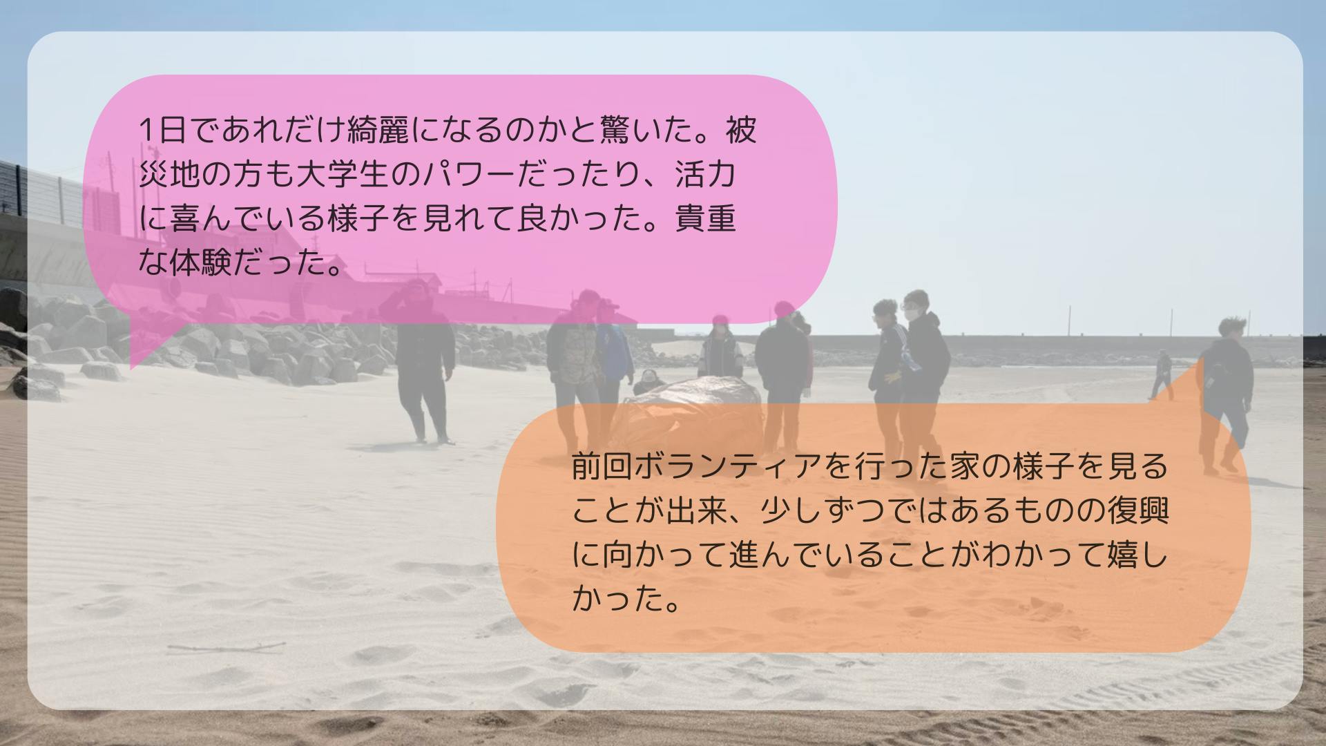 年が明け令和7年3月に第3回ボランティアバスを実施しました。ビーチクリーンのお手伝いだったのですが、一大イベントだったからか、輪島黒島町に明るさを感じました。海岸に打ち上げられた、川から流れてきたゴミや木を片付け、最後にはとても綺麗なビーチを見ることが出来ました。