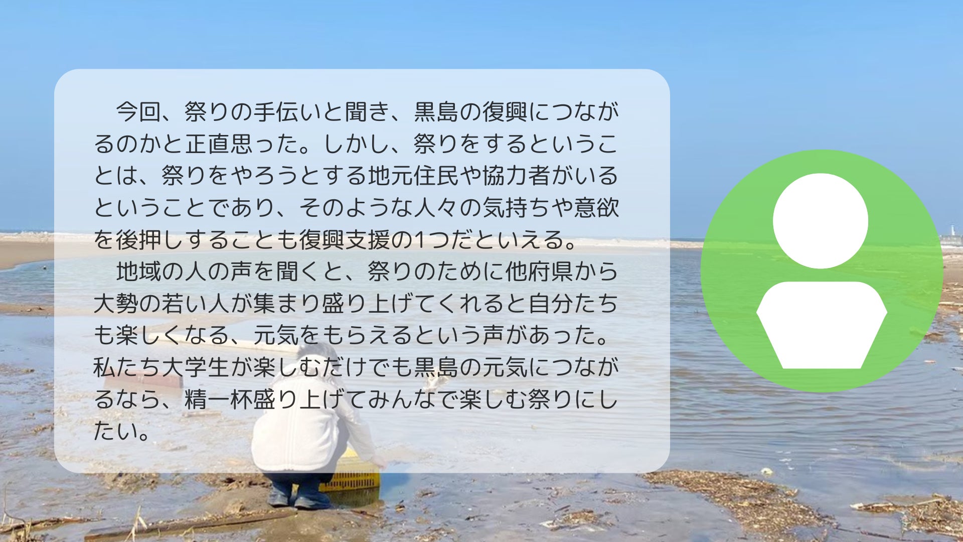 過去3回の継続的な活動を通じて、能登半島黒島町の遅々として進まない状況をまじかで見てきました。復興の1つのゴールとして、関西の大学生と輪島住民による天領祭を実現させたいです。