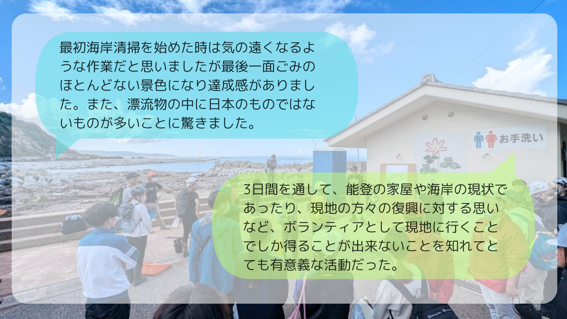 年が明け令和7年3月に第3回ボランティアバスを実施しました。ビーチクリーンのお手伝いだったのですが、一大イベントだったからか、輪島黒島町に明るさを感じました。海岸に打ち上げられた、川から流れてきたゴミや木を片付け、最後にはとても綺麗なビーチを見ることが出来ました。