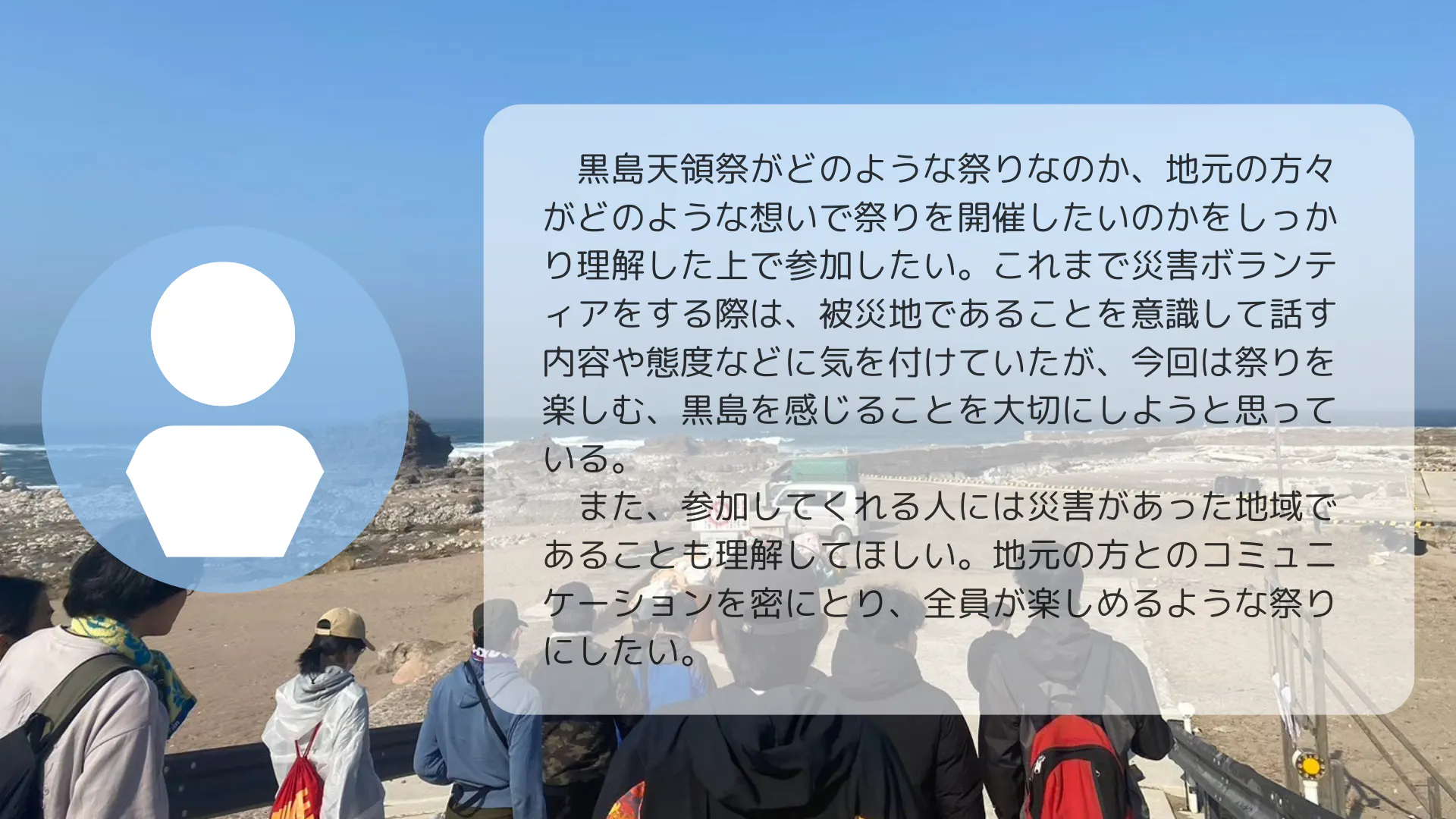 過去3回の継続的な活動を通じて、能登半島黒島町の遅々として進まない状況をまじかで見てきました。復興の1つのゴールとして、関西の大学生と輪島住民による天領祭を実現させたいです。