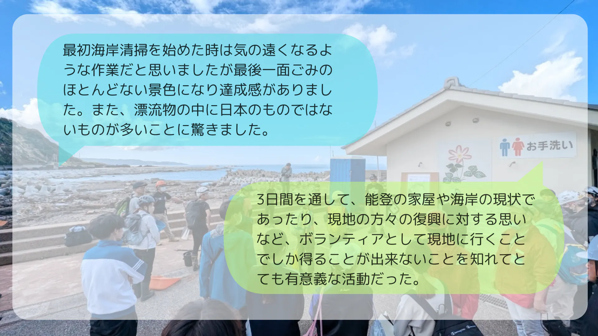 年が明け令和7年3月に第3回ボランティアバスを実施しました。ビーチクリーンのお手伝いだったのですが、一大イベントだったからか、輪島黒島町に明るさを感じました。海岸に打ち上げられた、川から流れてきたゴミや木を片付け、最後にはとても綺麗なビーチを見ることが出来ました。