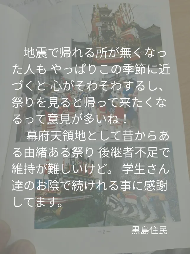 輪島は震災を経験し、水害をも乗り越えようとしています。輪島黒島町の象徴として、住民と大学生ボランティアによる天領祭を今年も成功させ、さらなる復興につなげたいです。