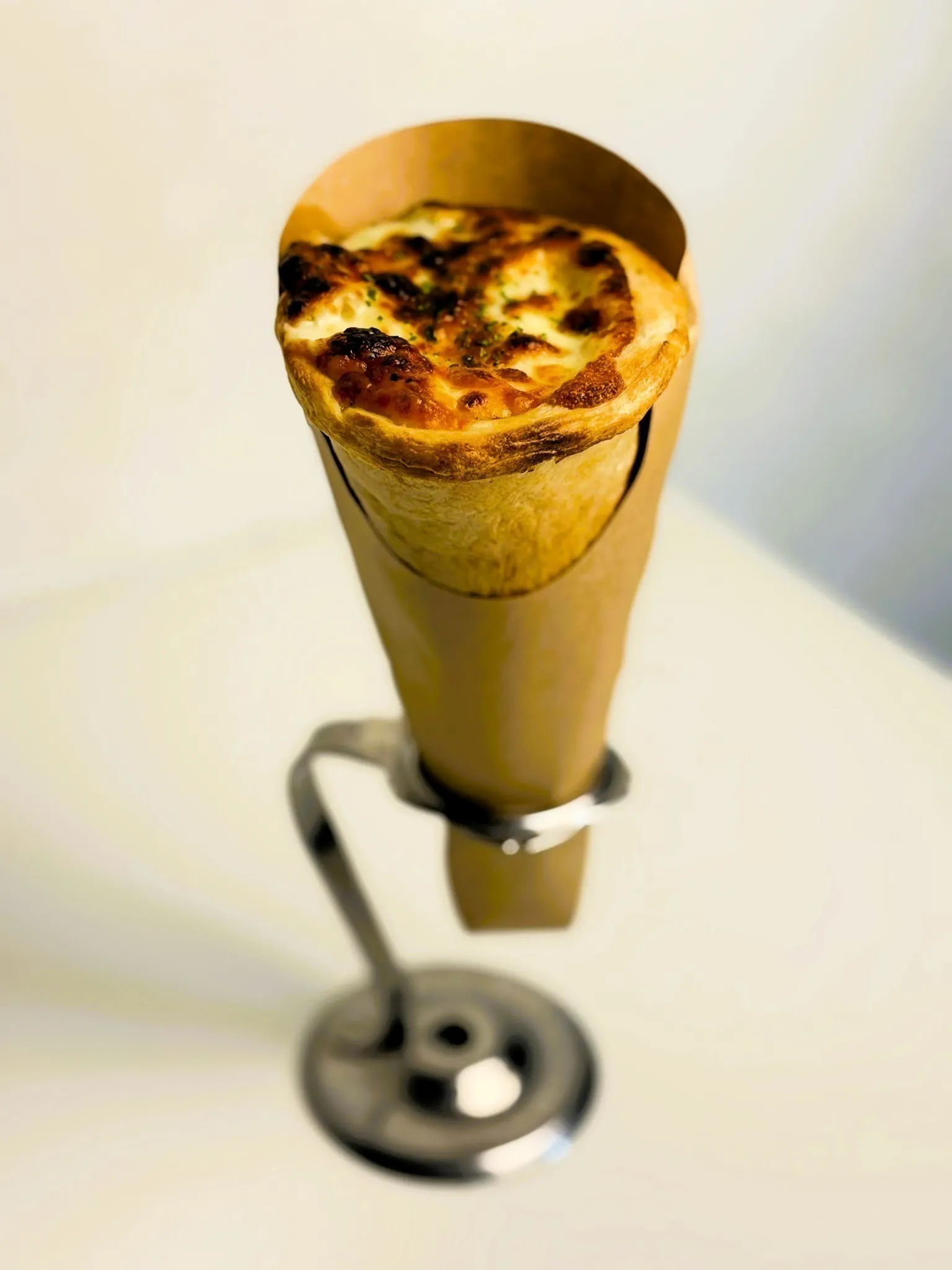 イタリアを中心にアメリカ、ブラジル、インド、タイなどで展開されている新感覚フードで、アイスコーンのような形状のピザ生地に具をのせて焼き、提供される、片手で食べられるピザです。