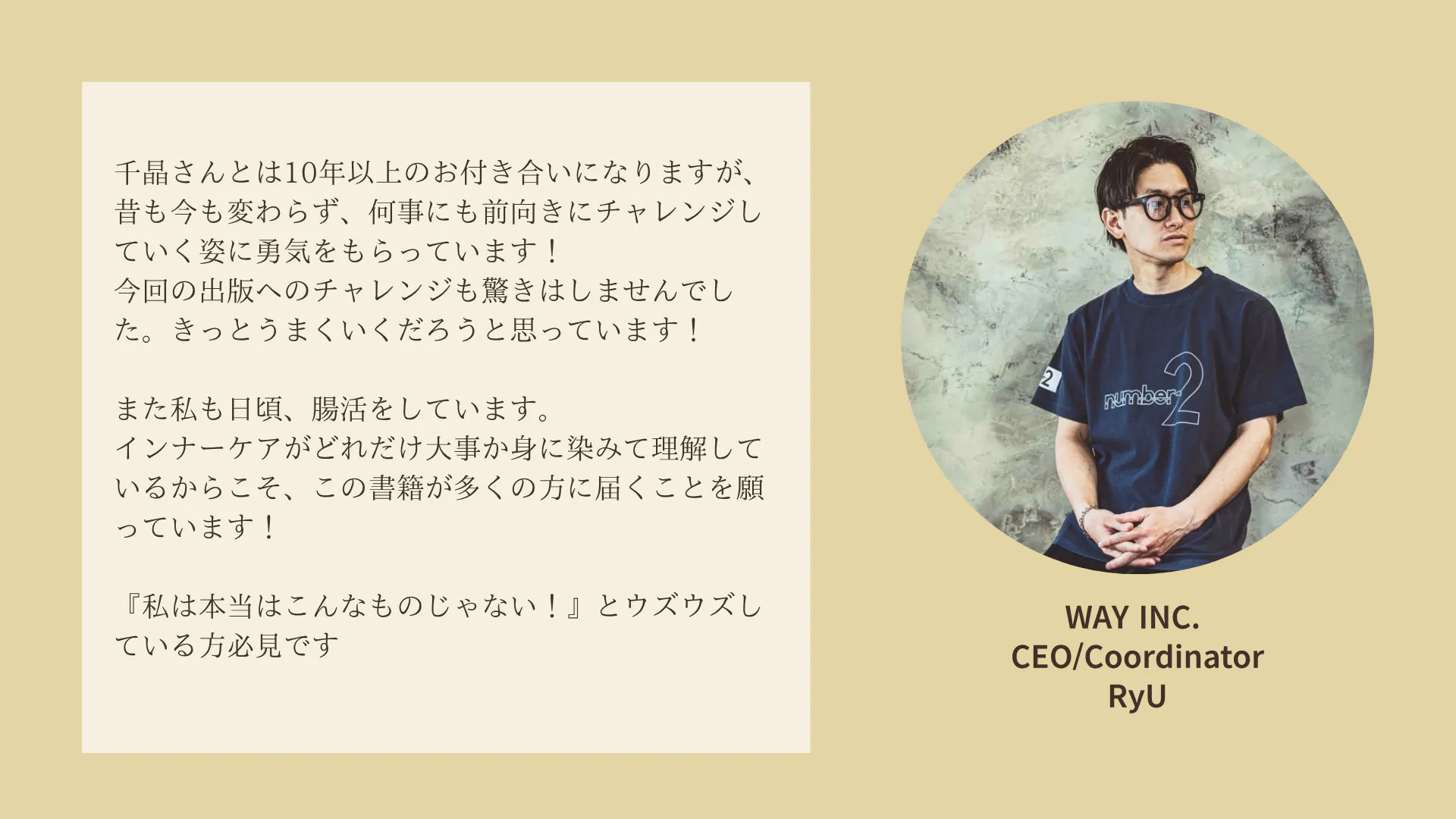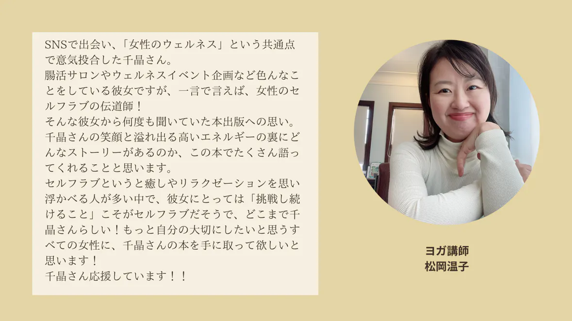 「でも」「だって」という言葉は、幸せを遠ざけてしまいます。せっかく女性に生まれたのだから、美しく輝くことを諦めてほしくない。そんな女性たちに、この本を通じて「あと一歩を踏み出す勇気」や「自分と向き合うきっかけ」、「内側から叶える美しさの秘訣」を届けたいと思い、出版を決意しました。