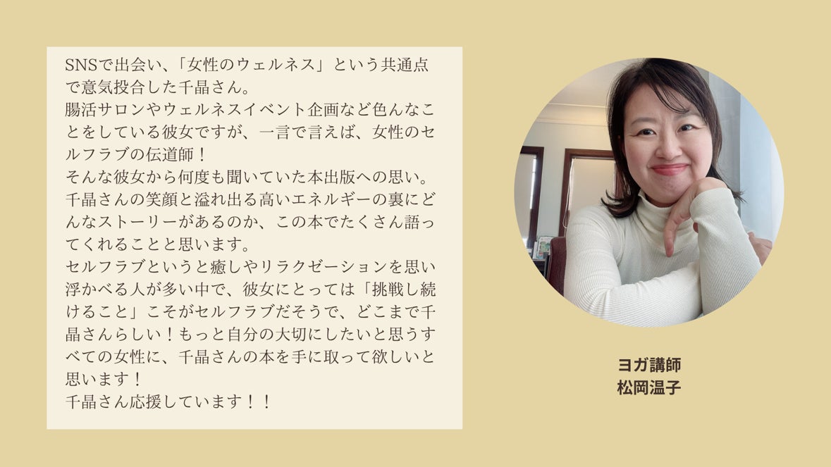 ごきげんで輝く自分になるチャンスは、誰かが与えてくれるものではなく、自分自身で進んで行くことで掴めるものです。すべての女性のウェルネスとセルフラブを願った1冊になっています!この本があなたが自分の「幸せの源」に気づき、内側から輝く一歩を踏み出すきっかけとなれば、これ以上の喜びはありません。