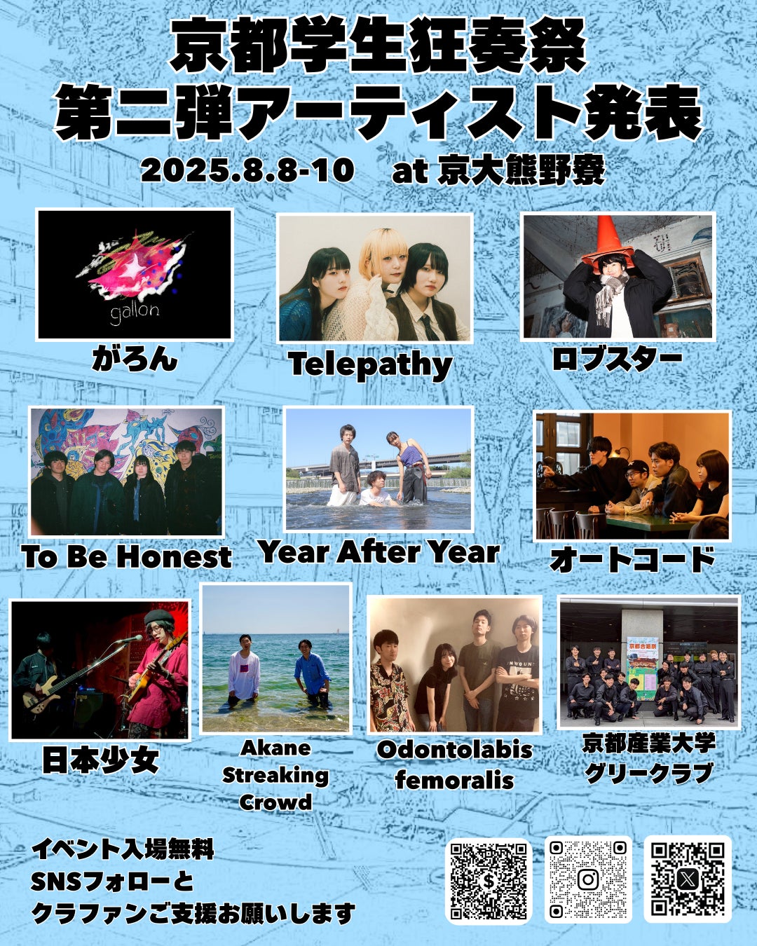 ロブスター、To Be Honest 、オートコード、日本少女、Akane Streaking Crowd、京産大グリークラブなど、昨年も出演したアーティストに加え、今年はがろん、telepathy 、Year After Year、Odontolabis femoralisといった新しいアーティストの方々にも出演していただきます!
