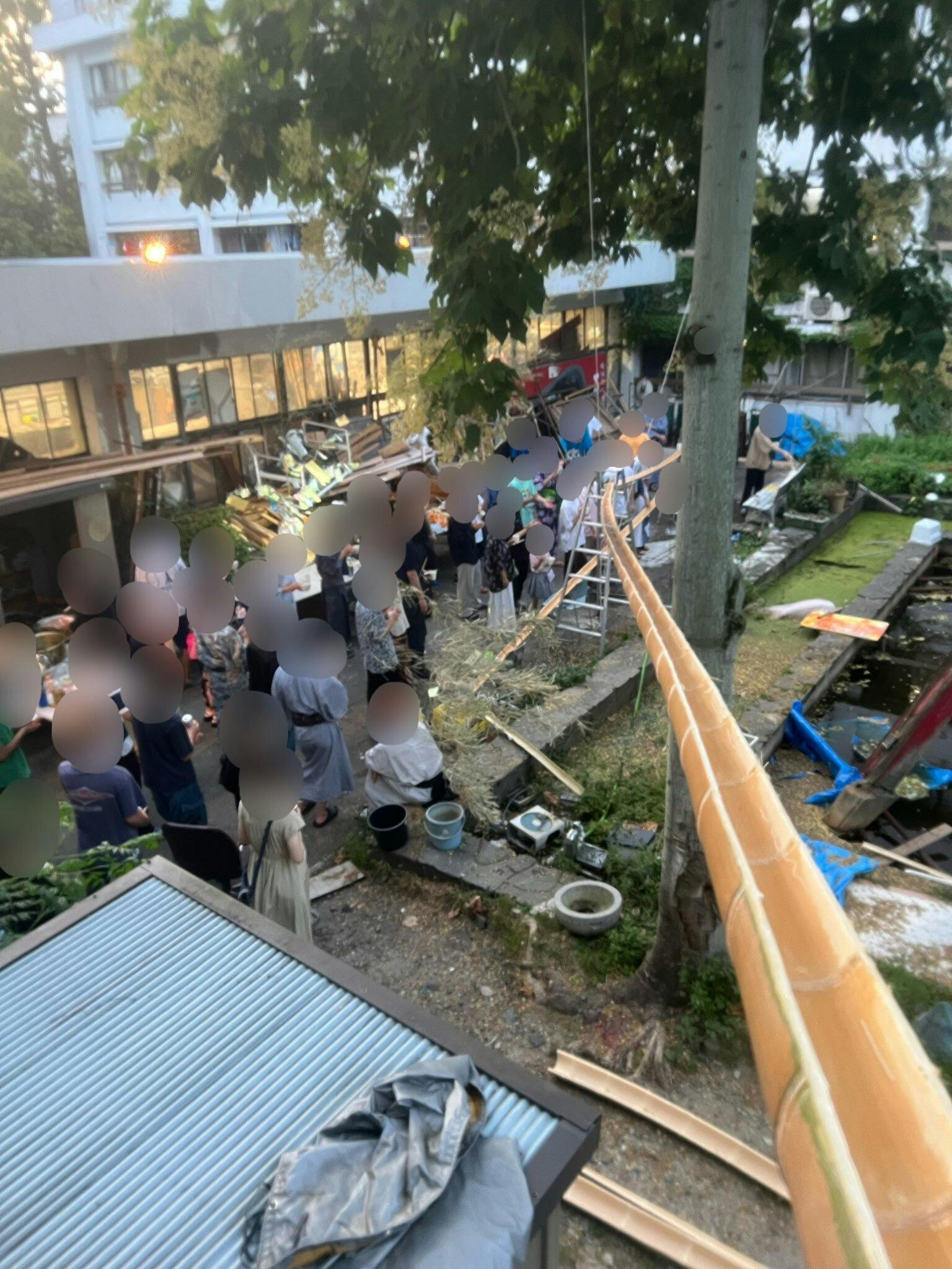 先日7月6日は七夕コンパを開催しました。寮の中庭には民青池と呼ばれる池があり、その前でたびたび寮のコンパが開催されます。七輪を使って肉や魚を焼くコンパもありますが、やはり七夕コンパの目玉は、流しそうめんです!七夕コンパの流しそうめんでは、寮の炊事場の2階や3階の炊事場から10mほどの竹を連結させてそうめんを流します。