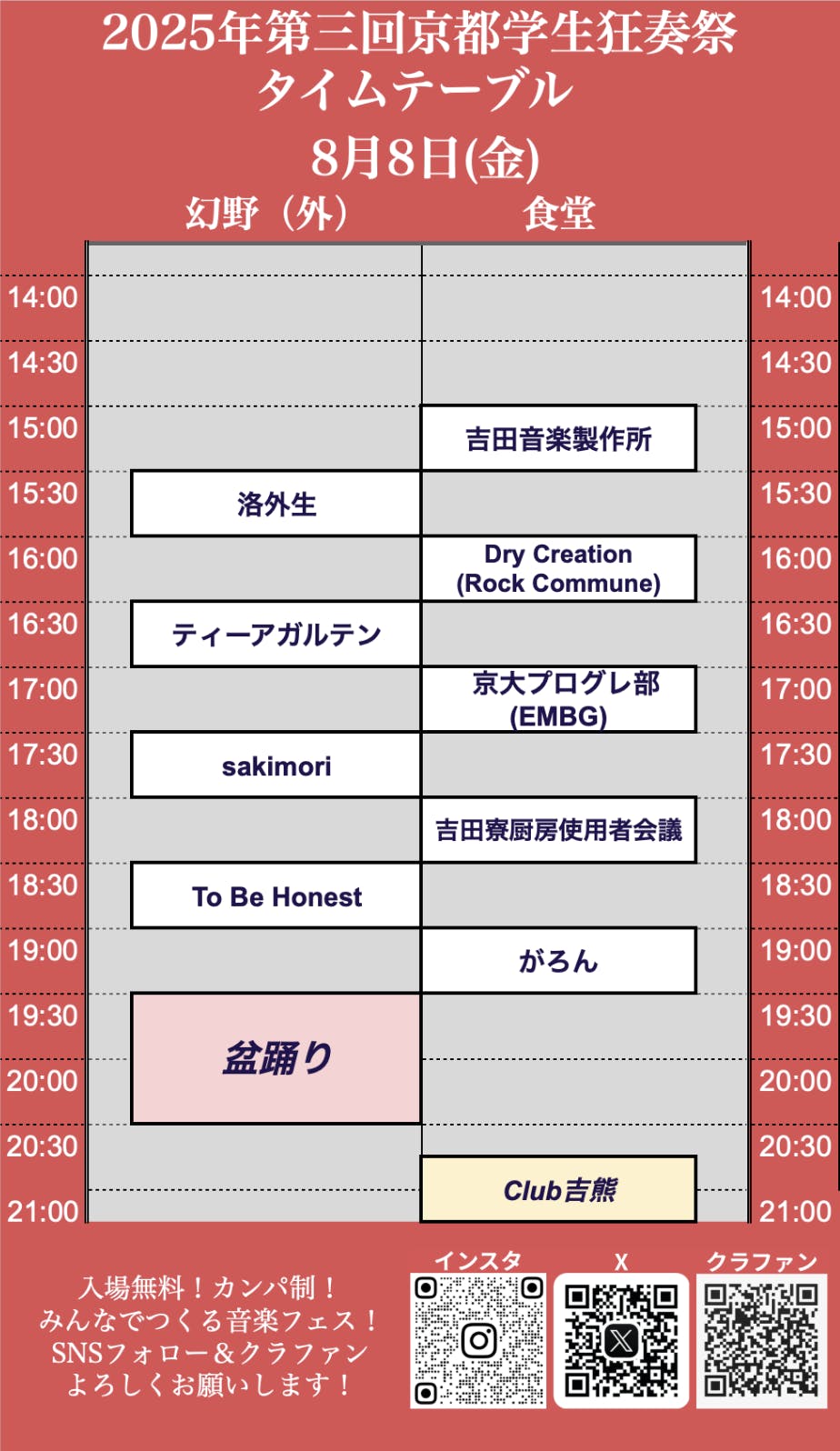 また、盆踊りの後には食堂でClub吉熊です!盆踊りからクラブと、朝まで踊り明かしましょう!また、吉田寮厨房利用者会議の出演もあり、熊野寮と吉田寮のコラボ感のある1日です。