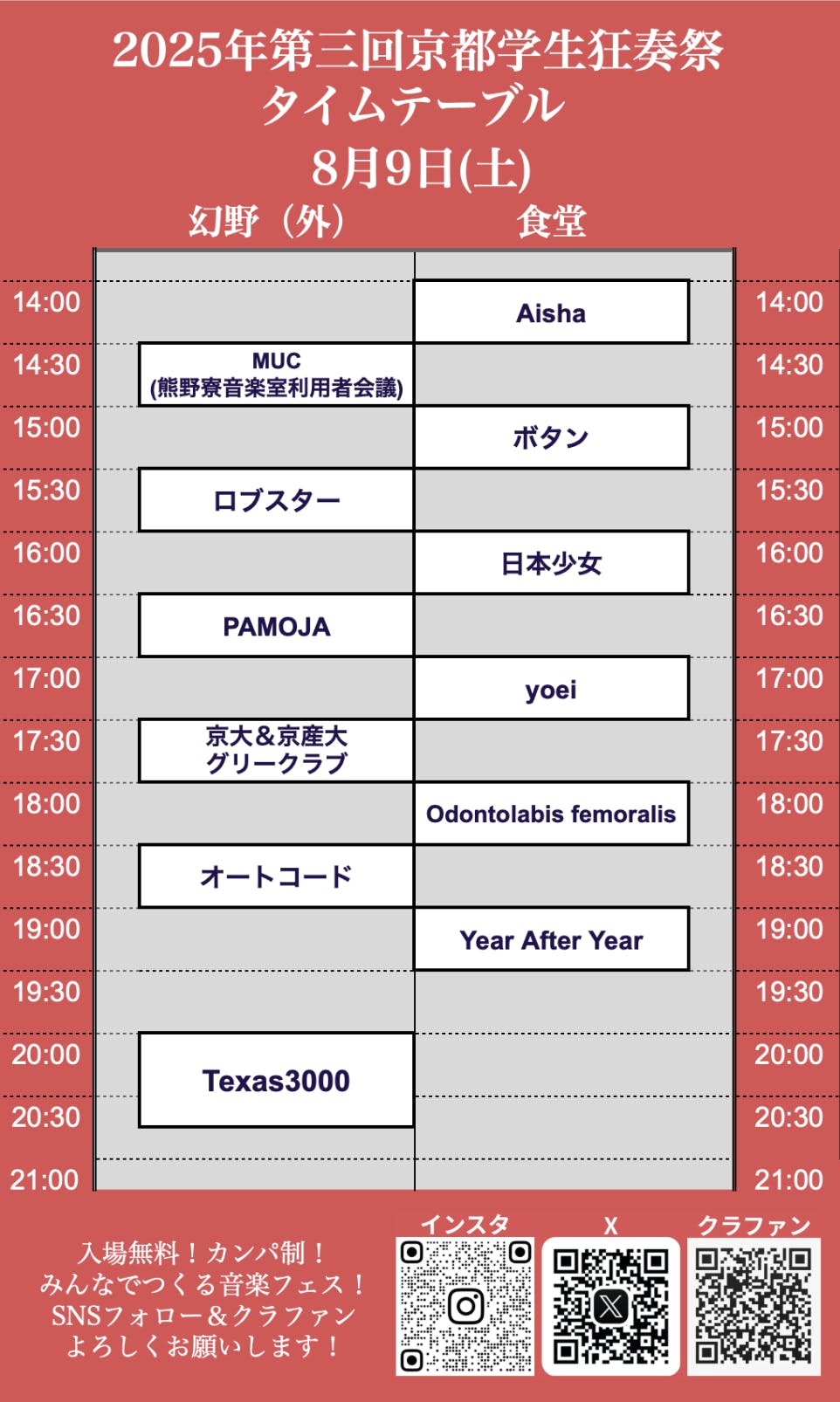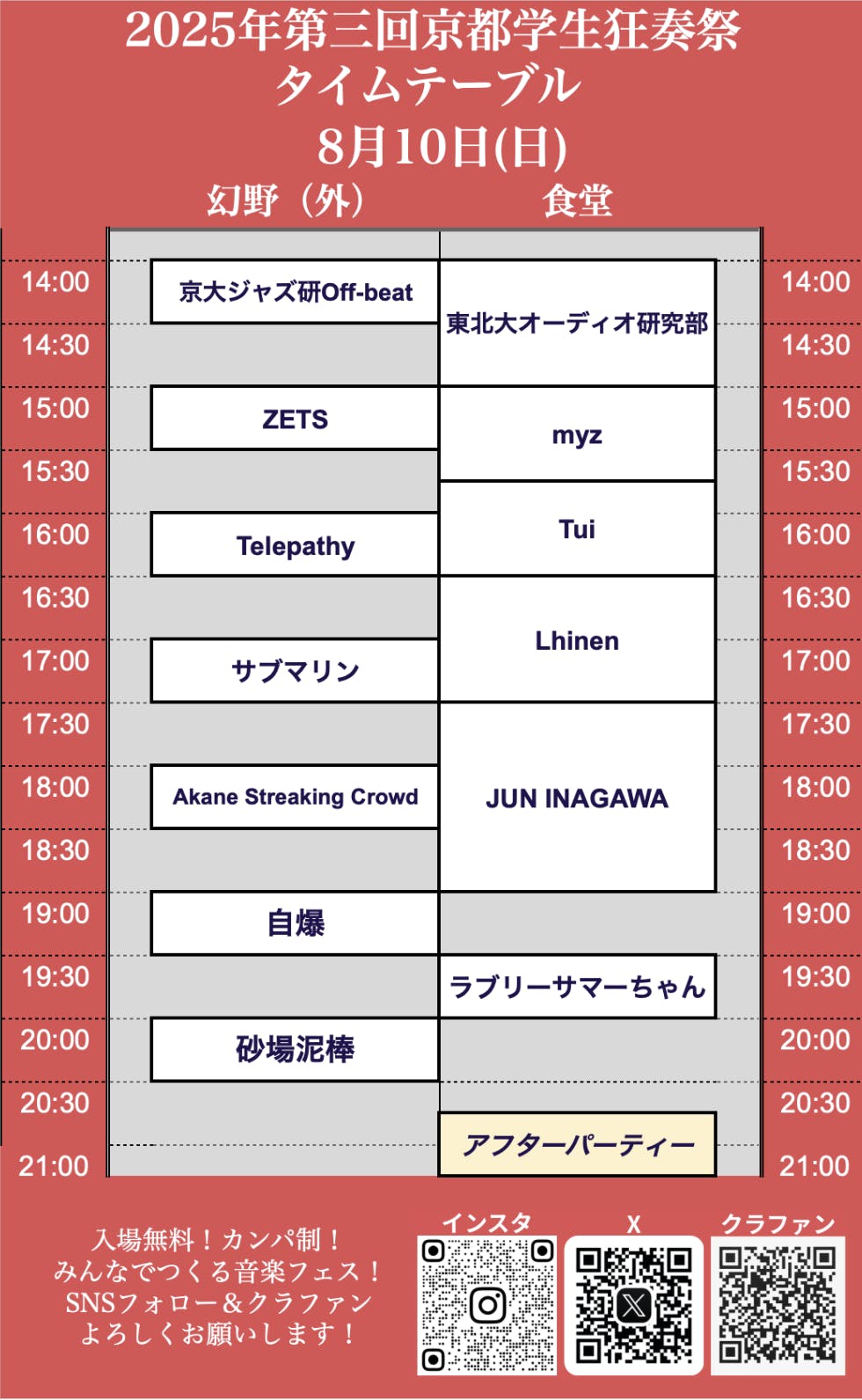 そして幻野ステージ、食堂ステージともに、JUN INAGAWA、自爆、ラブリーサマーちゃんといったプロのアーティストが続いた後に、熊野寮発バンド、砂場泥棒が出演します!