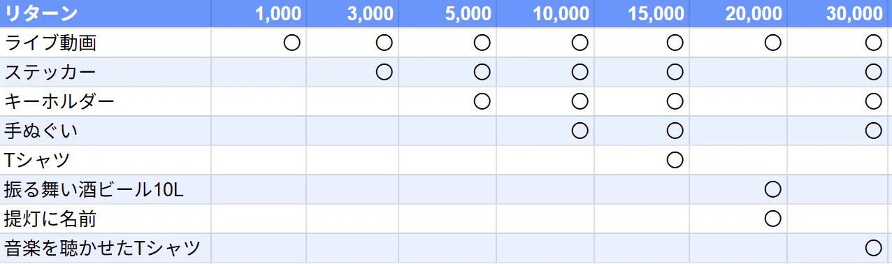 ご支援いただいた方全員に、お礼のメッセージと2日間のライブ動画(編集有り)をお送りいたします。また、支援額に応じてオリジナルグッズやその他特別なリターンもお送りいたします(詳細欄をご覧ください)。
