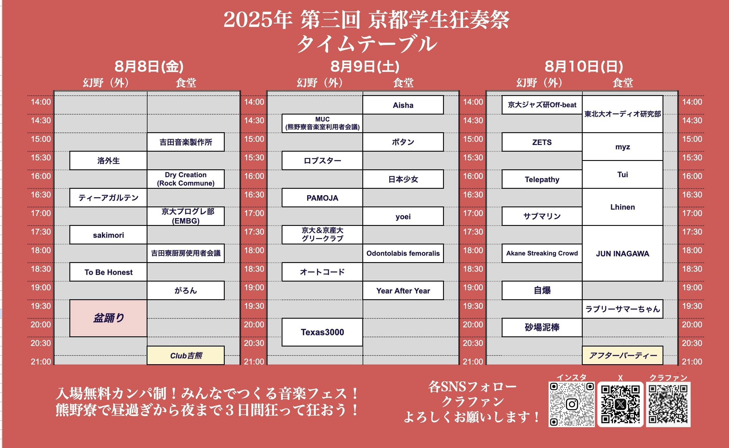 2025/08/06 12:00狂奏祭のタイムテーブルが公開されたので紹介します!まず1日目です!sakimoriやがろんなど、様々なオリジナルバンドが出演した後に、幻野ステージで盆踊りです!また、盆踊りの後には食堂でClub吉熊です!盆踊りからクラブと、朝まで踊り明かしましょう!また、吉田寮厨房利用者会議の出演もあり、熊野寮と吉田寮のコラボ感のある1日です。2日目です!2日目、8月9日は日本少女、yoei、オートコードなど、京都で活躍するオリバンが続いた後、現在注目を集める3人組、texas3000が出演します!バンド色の強い一日です。3日目!3日目は2ステージの強みを活かし、幻野ステージではバンド形式の出演が続く一方、食堂ステージではDJ陣が活躍します!そして幻野ステージ、食堂ステージともに、JUN INAGAWA、自爆、ラブリーサマーちゃんといったプロのアーティストが続いた後に、熊野寮発バンド、砂場泥棒が出演します!さらに、アフターパーティーでは大量の炊き出しでのコンパ×これまでの出演者によるDJを行い、狂奏祭はまだまだ終わらない...といったタイムテーブルとなっております!興味を持たれた方は、是非ご支援をよろしくお願いいたします! もっと見る