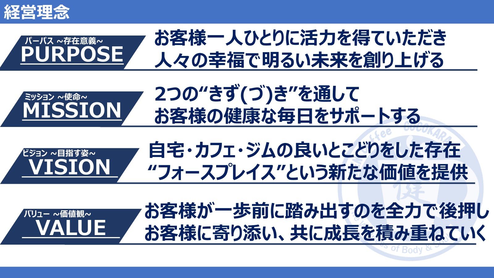 「PURPOSE~存在意義~」「MISSION~使命~」「VISION~目指す姿~」「VALUE~価値観~」