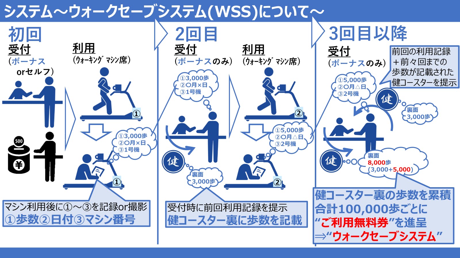 更に更に、ご利用いただいたウォーキングマシンの日々の歩数を記録、累計し、ある程度の歩数が貯まったらご利用無料券を進呈する、