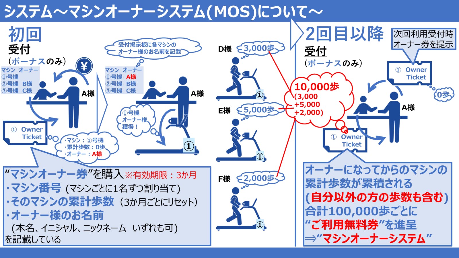 ウォーキングマシンのオーナーになることで、そのマシンの累計歩数(自分以外の方の歩数も含む)がある程度貯まったらご利用無料券を進呈する、