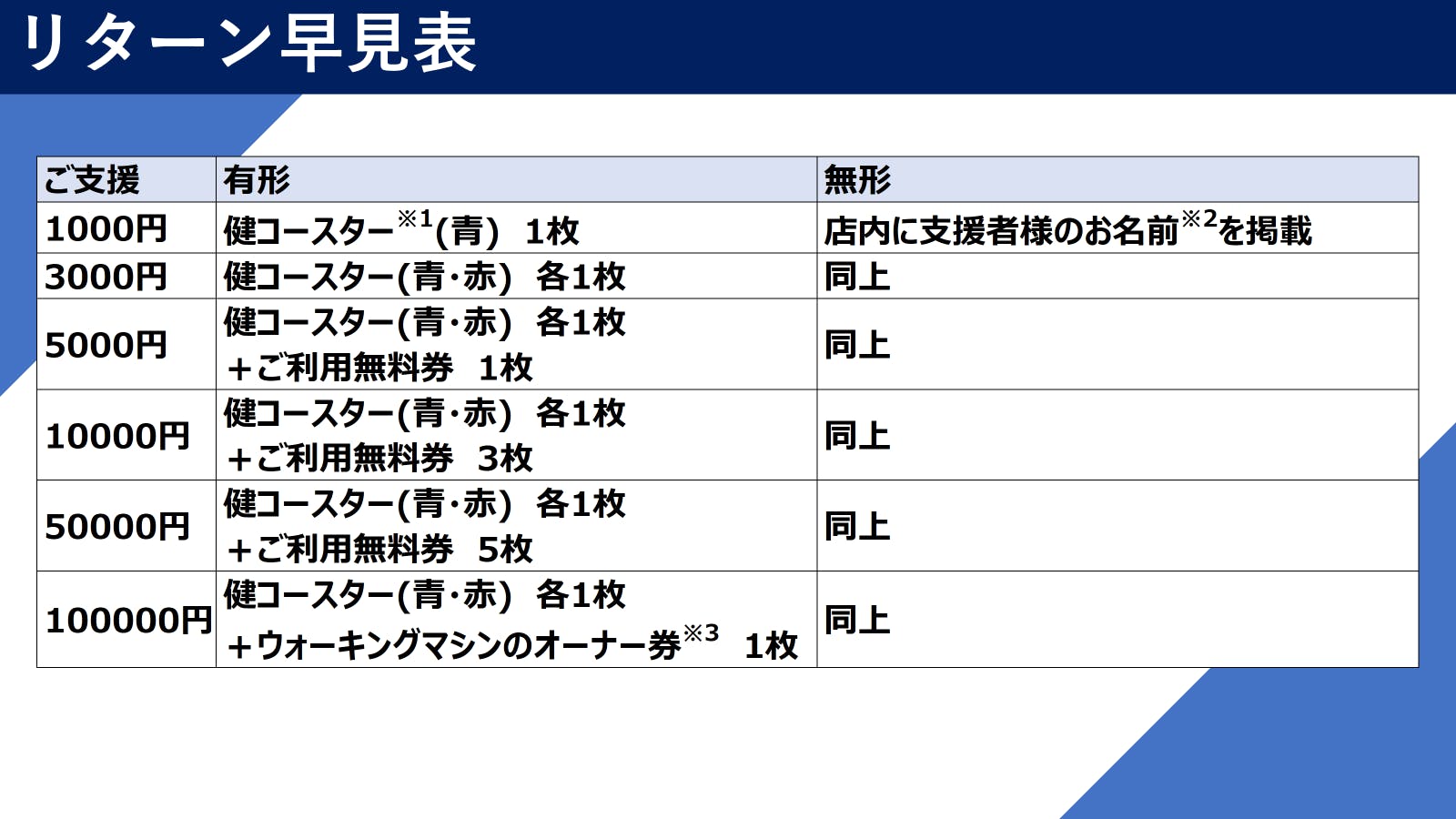 全国に発送させていただく”有形型”と、店内に掲載させていただく”無形型”の2タイプのリターンを準備しております。(有形型、無形型いずれかをお選びください)