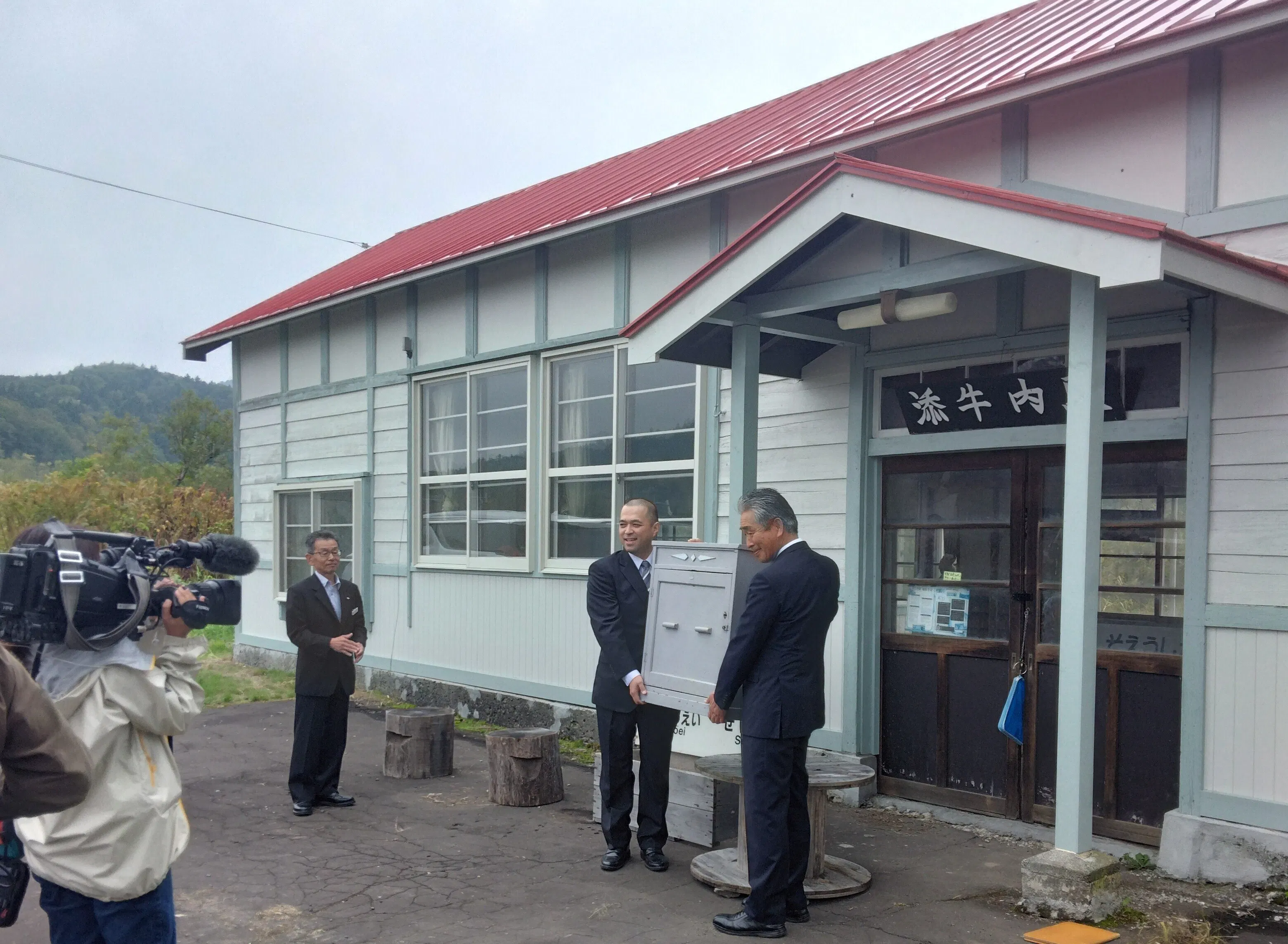 愛別町には博物館が無く、収蔵庫と言う築100年を超える雨漏りがする倉庫に乱雑に放り込まれている文化財を見学に行った3年前の事。まず閉塞機とタブレットが目に入った。その奥にほこりをかぶった箱がポツンと。雰囲気的に切符保管箱だと感じ扉を開けるとそこに一枚の紙が貼ってあった。添牛内駅と真ん中にあり、幌加内、朱鞠内など旧深名線の駅名がずらり。その駅までの料金が書いてあった。もしやこれは添牛内駅の切符保管箱じゃないか?と思った。旧添牛内駅はクラウドファンディングで駅舎を修繕する活動をしていたのを知っていたので、ぜひあるべき場所へ返したい!と考え、愛別町と折衝して返還許可をいただいた。添牛内駅保存会会長にも連絡をしたところ、とても驚かれて話が進んでいった。令和5年9月28日に返還のセレモニーが行われ両町の町長、保存会会長、それに私も参加しました。愛別町と幌加内町のご縁が深まる出来事でした。