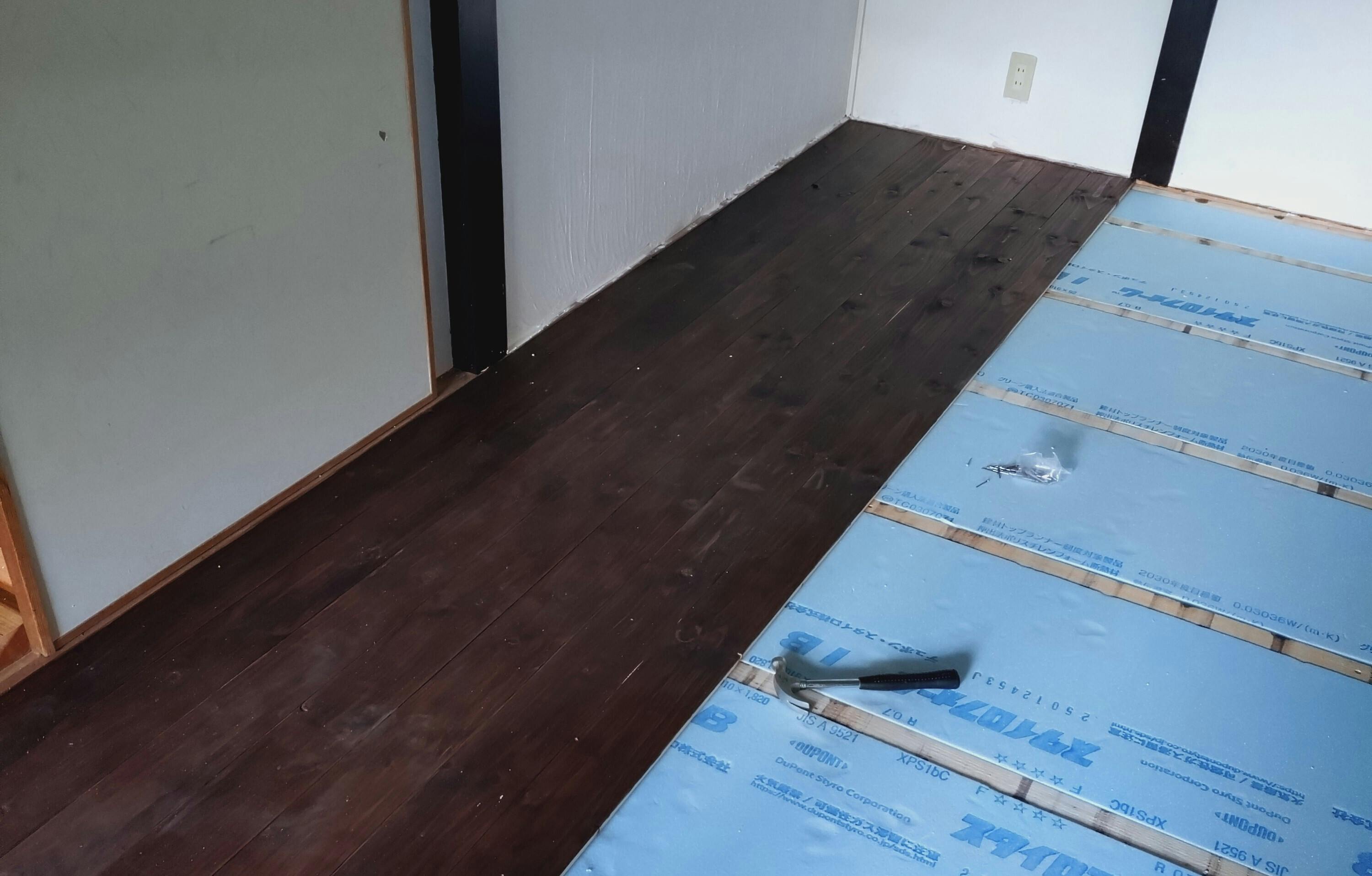 住宅部分は博物館コーナーと飲食スペースに改装中で、ひとりDIYで二部屋の押し入れ部分を抜いてワンフロア化し、畳をフローリングに張替え展示物の搬入をしました。ベランダ側にイスとテーブルを設置。大雪山を一望できる様にしました。
