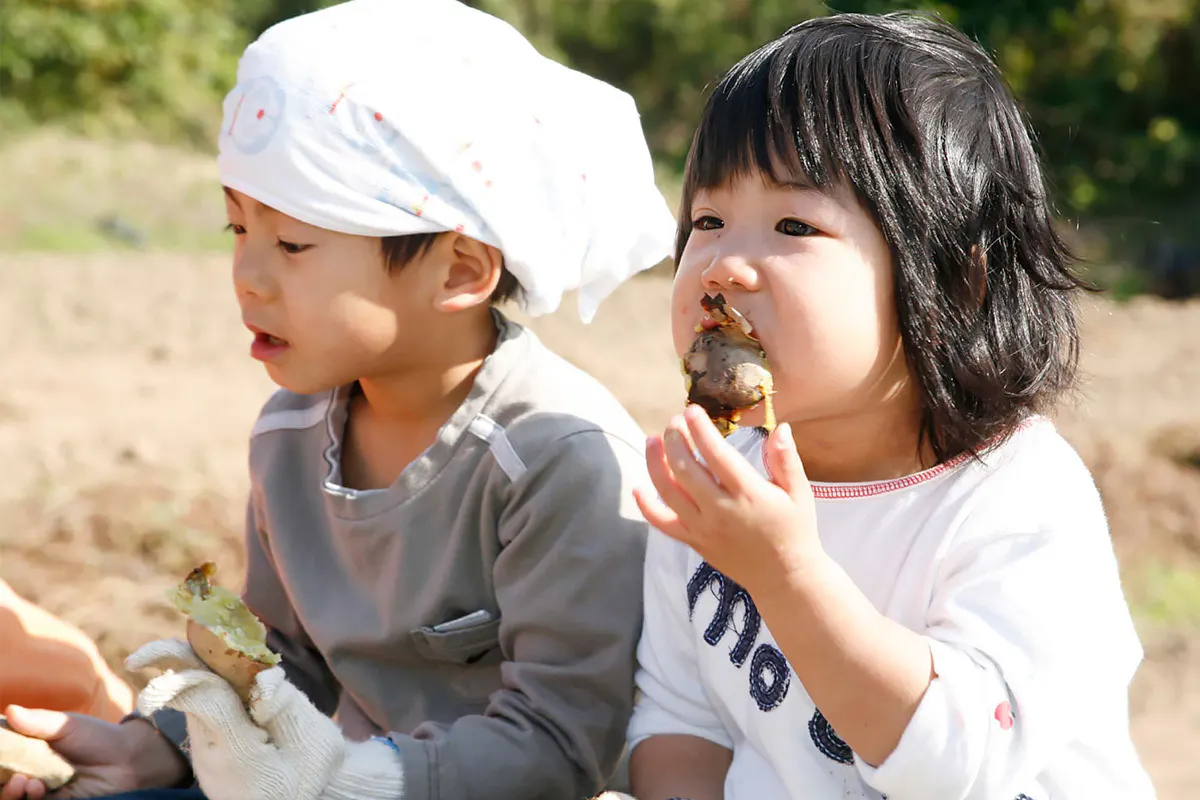 収穫された白芋を焼き芋にして食す、在りし日の白石徹さん(ご遺族提供)
