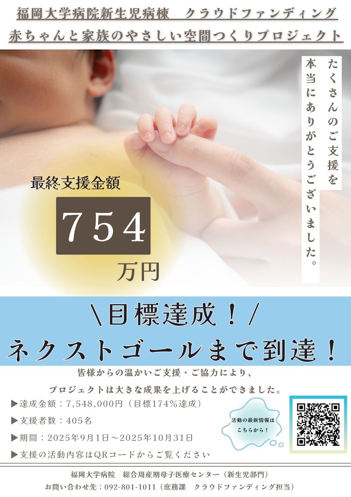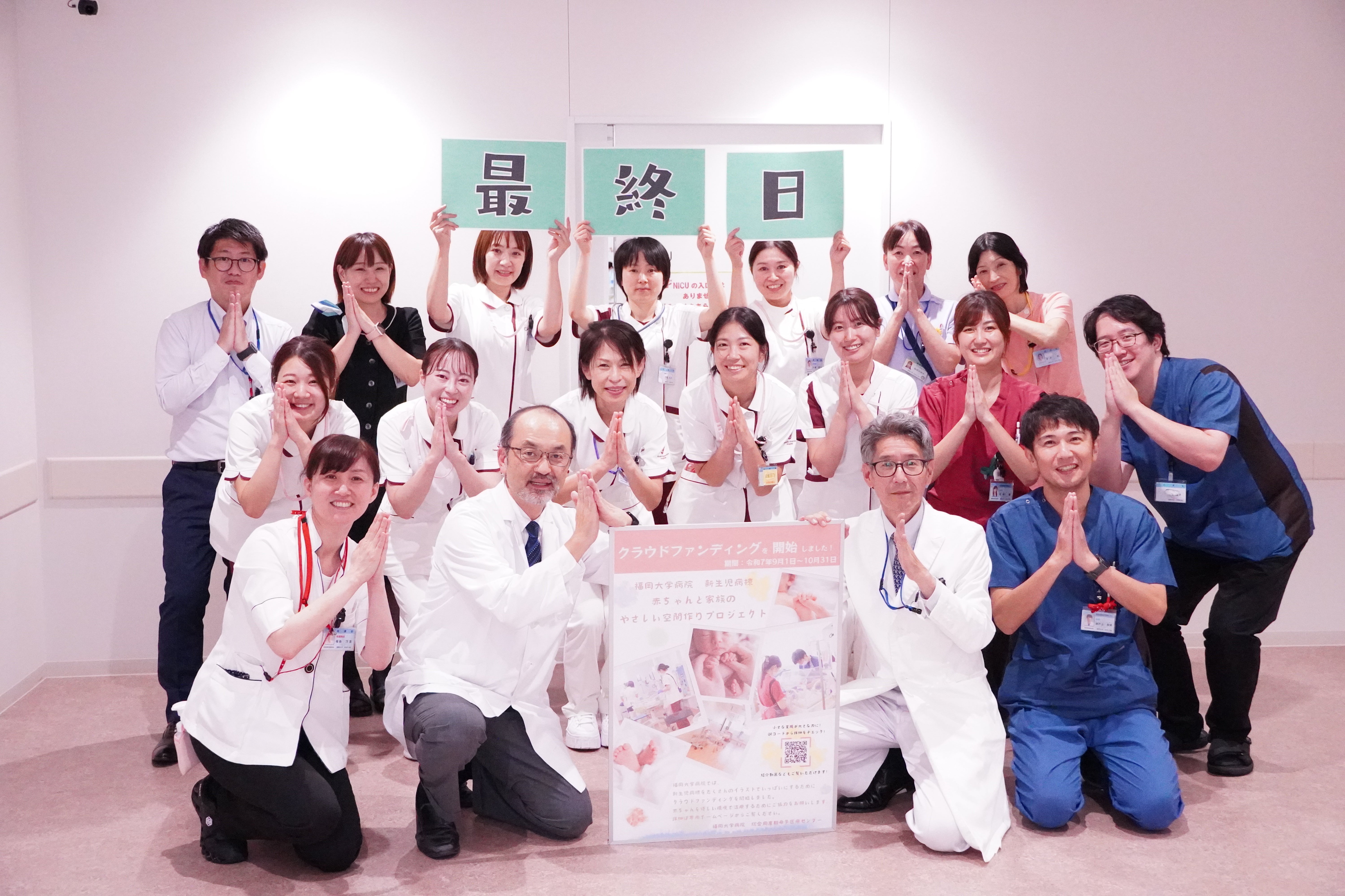 2025/12/09 11:20このたびは「赤ちゃんと家族の“やさしい空間”づくりプロジェクト」に 温かいご支援を賜り、心より御礼申し上げます。 皆さまのお力添えにより、目標を大きく超えるご支援をいただき、 NICUの環境改善に向けて大きな一歩を踏み出すことができました。現在、壁紙や装飾の準備を進めており、赤ちゃんとご家族が少しでも安心できる空間を整えるため、スタッフ一同心を込めて取り組んでおります。施工の様子や完成後の写真も、今後こちらでご報告させていただきますので、ぜひ楽しみにお待ちください。また、院内にクラウドファンディング達成のポスターを掲示したところ、 患者さんから「よかったね」「がんばってね」という温かいお声をいただきました。皆さまのご支援が、院内にも前向きな空気を広げていることを実感しています。なお、リターン(お礼状、寄付金領収書、感謝状等)送付にあたり、住所情報が不明または確認が必要な場合がございます。その際は、福岡大学財務課より個別にメッセージ、メール、またはお電話で確認をさせていただくことがございますので、何卒ご理解とご協力をお願い申し上げます。引き続き、赤ちゃんとご家族に“やさしい空間”を届けるため、 スタッフ一同尽力してまいります。今後とも温かいご支援とご声援をよろしくお願いいたします。福岡大学病院 赤ちゃんと家族の“やさしい空間”づくりプロジェクト一同 もっと見るNEXT GOAL 達成しました!!!ご支援ありがとうございます!!!