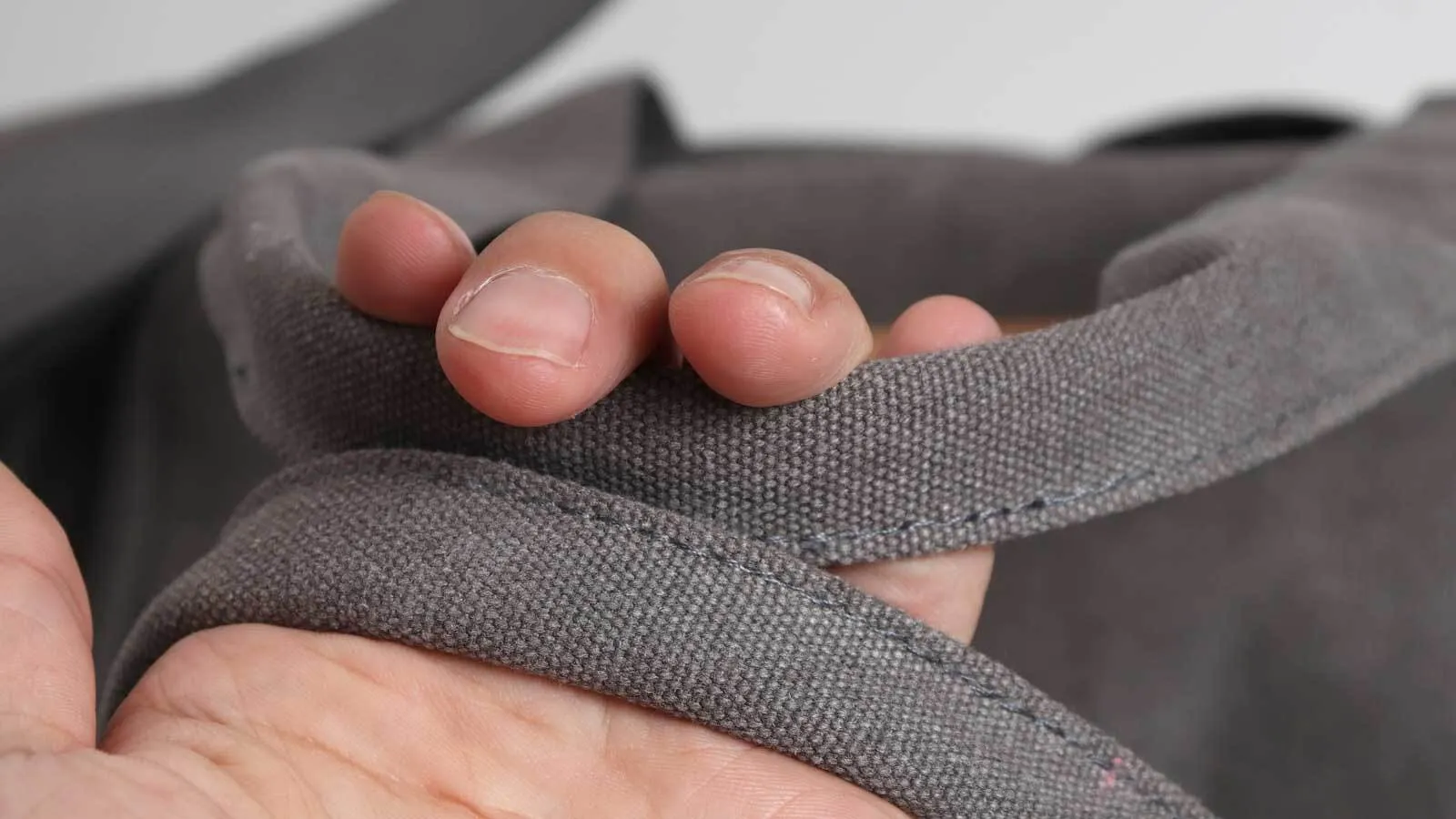 A. 帆布生地は洗い加工を行うために濃色ではなく全体的に白みがかった淡い色味となります。また素材の特性上、糸の太さなどによって色が染まりにくくなる部分が生じ白くスジのような線が出てしまう場合がございます。裁断の際にこちらの部分だけ取り除くことが難しく帆布生地の特性として良品とさせて頂いております。