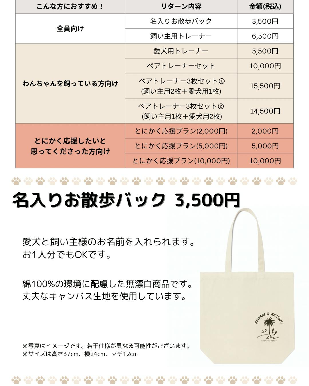 日常に取り入れやすいデザインと、手に取りやすい価格で、愛犬とのおそろいをもっと身近に楽しんでほしい。そして、売上の一部で保護犬支援することで、1匹でも多くのわんちゃんを幸せにしたい。 そんな想いから、ペアルックブランドの立ち上げに向けてクラウドファンディングに挑戦します。