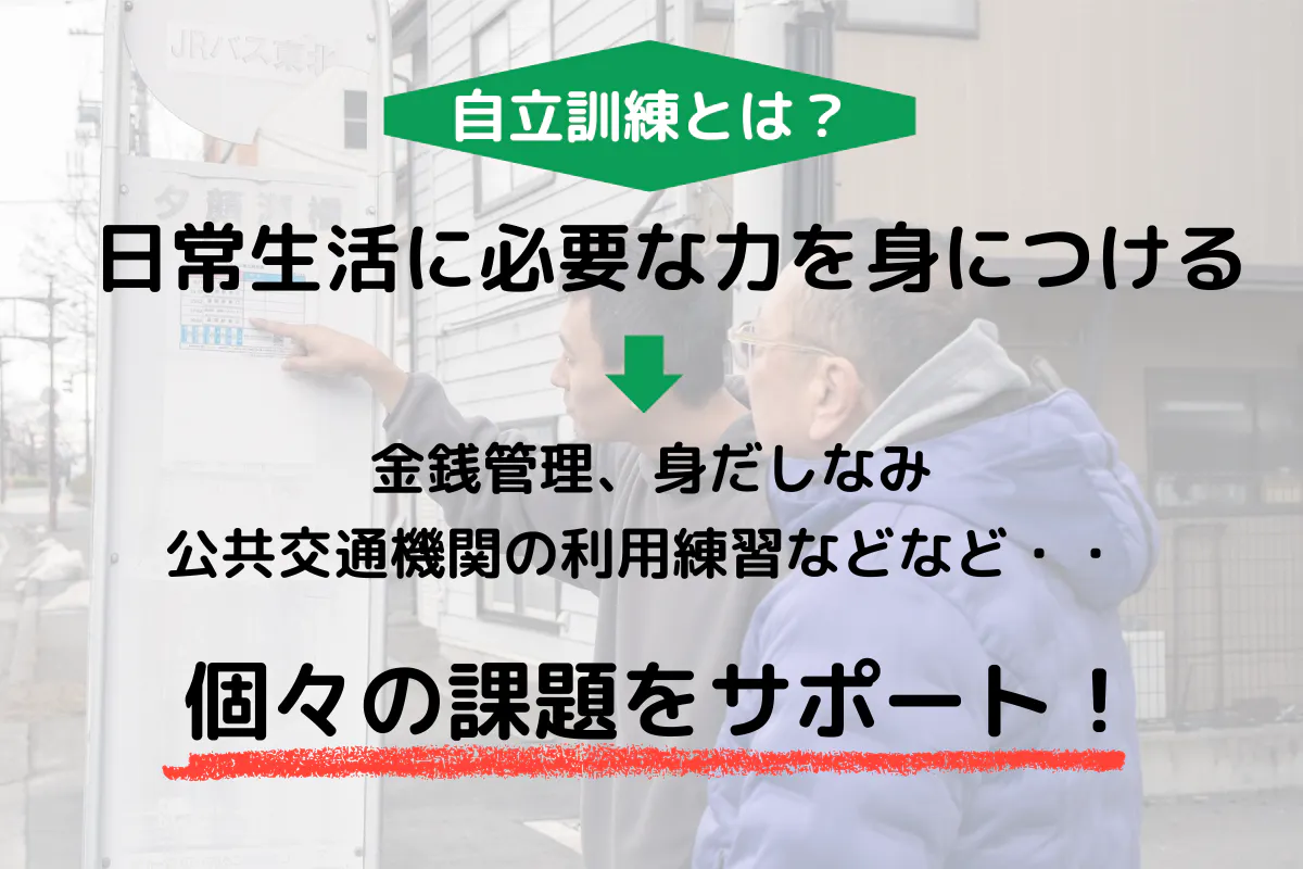 障がいのある方が、自立して日常生活を送るために必要な能力を身につける場所です。原則2年間という期限の中で、金銭管理・身だしなみ・公共交通機関の利用練習など、個々の課題に対するサポートを受けられます。 これによって利用者だけでなく、家族や保護者も安心して過ごせるようになり、お互いの負担を軽減できるのではないかと考えています。