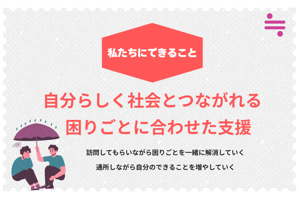 私たちが行っている「訪問型自立訓練」は、利用者の自宅へ伺い、一人ひとりが自分らしく暮らしていくためのサポートを行う支援です。