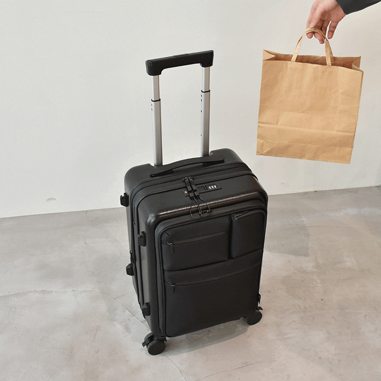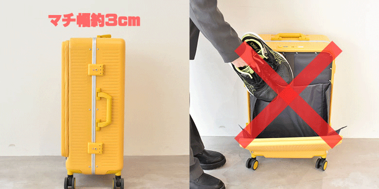 通常のフロントポケットはマチ幅が狭くパソコンや本など薄いコンパクトなものは収納が可能ですが仕切り板があるので靴やお土産などすぐに出し入れしたけど奥行がある荷物は収納できずスーツケースを地面に倒しカギを開錠してメイン収納に荷物を入れるしかありません。